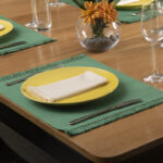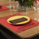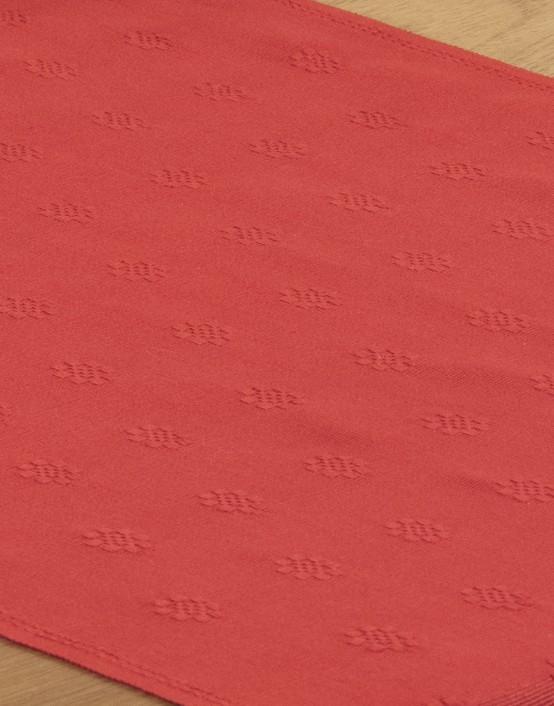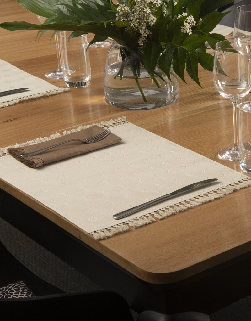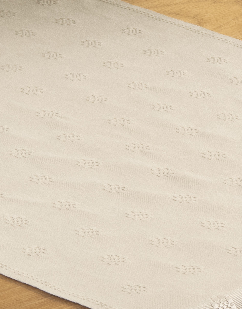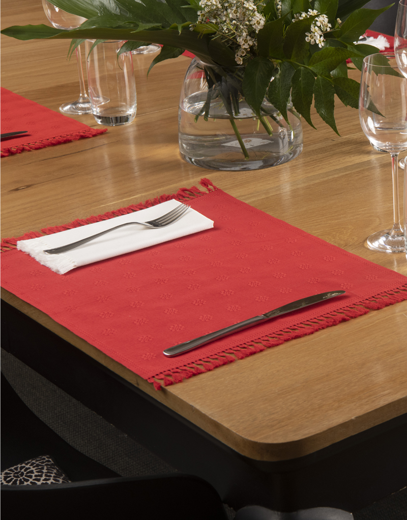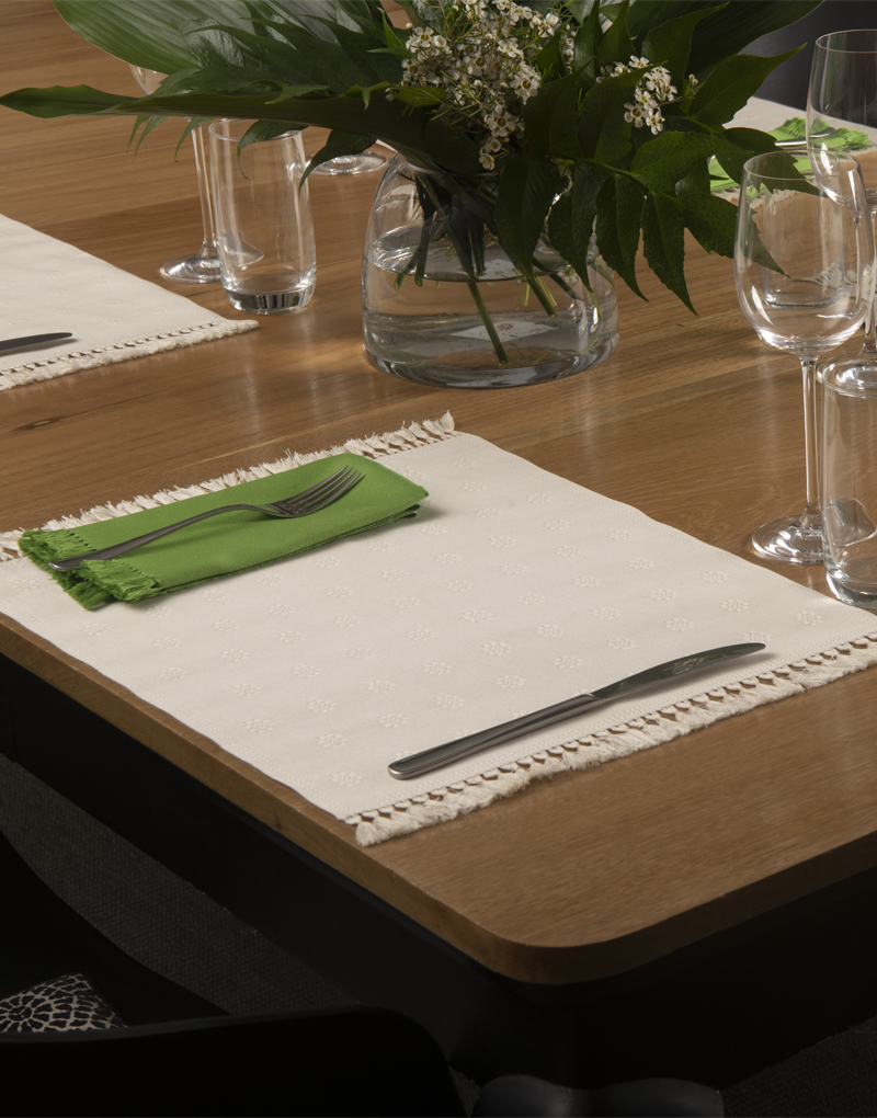 Set x2 individuales de tela delgada, con flores cuadradas, tejidos a mano con hilado de algodón Pima mercerizado. 35 x 42 cms con flecos simples.