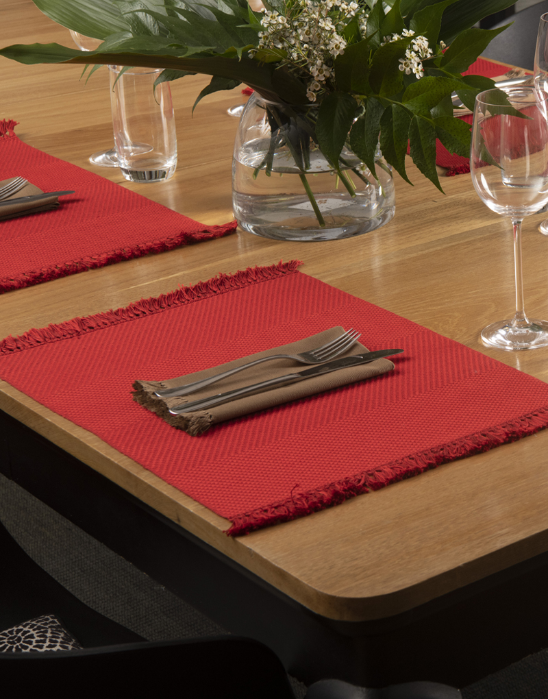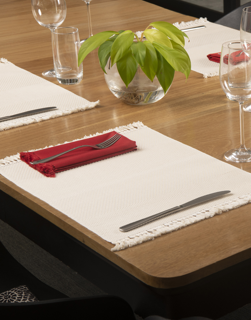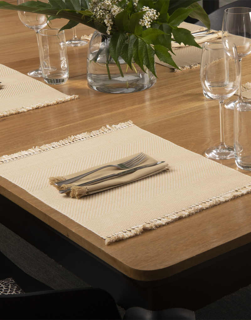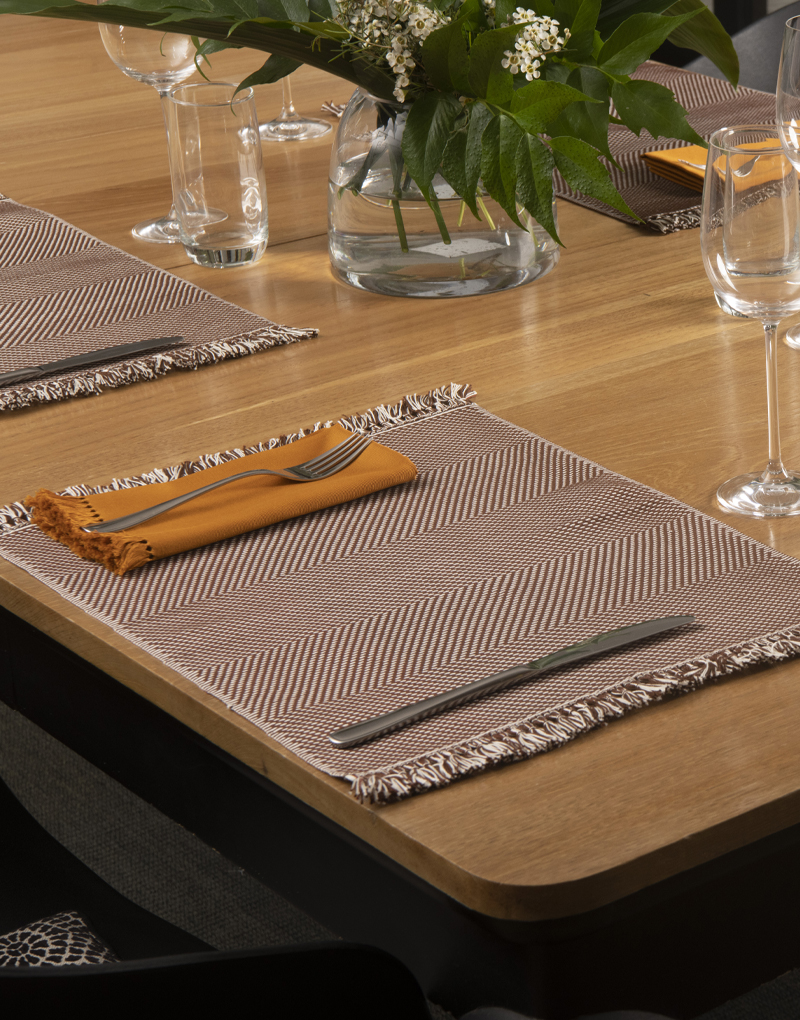 Set x2 individuales de tela gruesa, textura zigzag a dos colores, tejidos a mano con hilado de algodón Pima mercerizado. 35 x 42 cms con flecos simples.